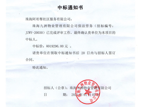 恭祝阿哥帮公司中标九洲物业保洁服务