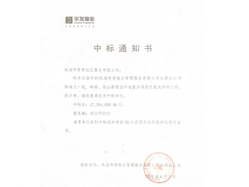 6月2日,经过与多家实力雄厚的单位激烈竞标,公司凭借过硬的资质、皇家的服务理念、合理的价格、诚实守信的经营方式、完善的管理制度体系等优势成功中标“珠海华发物业管理有限公司水郡分公司西部区域保洁外包服务项目”。本次中标再次奠定了公司在保洁行业创新发展趋势,也印证了公司的技术实力和客户口碑。希望此次中标项目强服务、保品质、做优质品牌服务项目!阿哥帮 助您旺!有事请找阿哥帮!